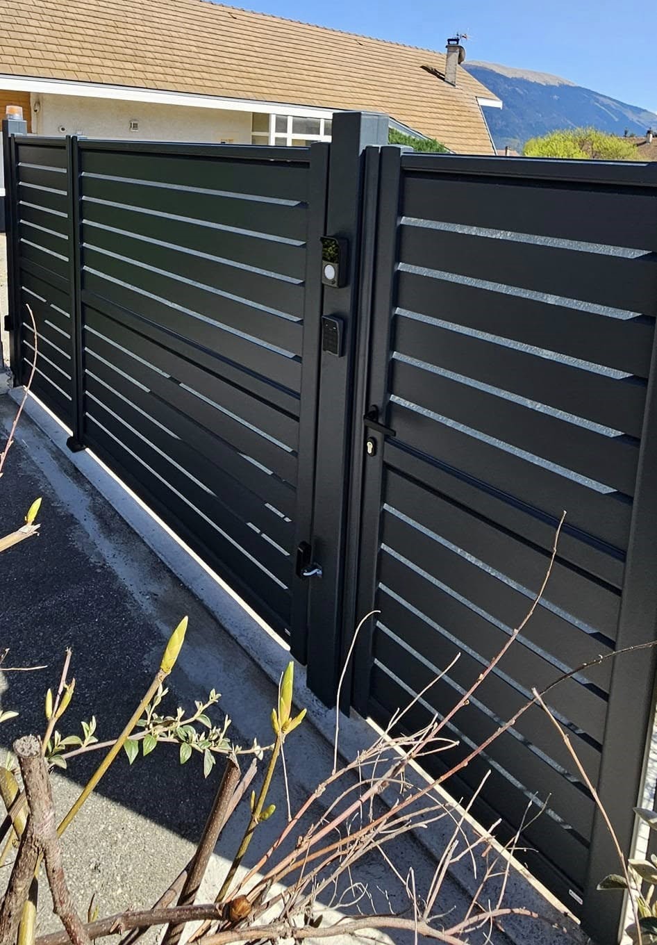 - Sécurité : Les portails en aluminium peuvent être équipés de systèmes de verrouillage et de sécurité avancés pour assurer la protection de votre propriété. De plus, leur structure solide et leur résistance intrinsèque en font un choix sûr pour limiter l’accès non autorisé.